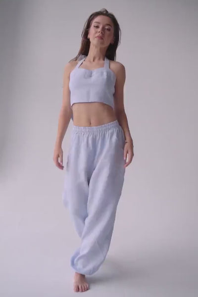 Chic and sculpted, this halter-style linen crop top is designed to accentuate your neckline and back. With adjustable ties and a supportive bodice, it’s a versatile statement piece for sunny days or nights out.