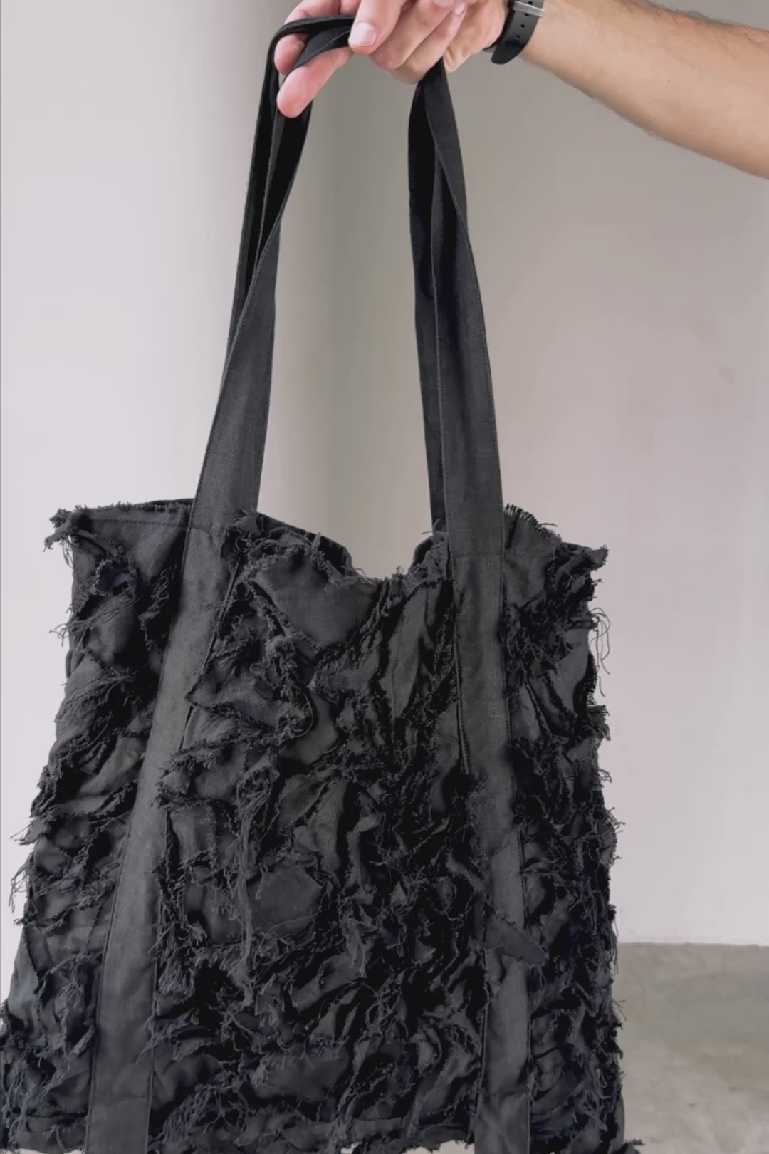 This tote bag is made using our original patchwork technique, developed as part of our commitment to reducing textile waste. Each piece of linen is hand-cut and sewn individually, forming a rich, textured surface. After assembly, the bag is washed to soften the fabric and give it a natural, lived-in feel.