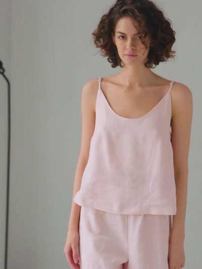 This minimalist linen camisole is a versatile essential for any warm-weather wardrobe. It features a soft scoop neckline, straight-cut back, and adjustable straps, all tailored in lightweight breathable linen. The relaxed silhouette offers comfort and understated elegance, whether worn as loungewear or a summer staple.
