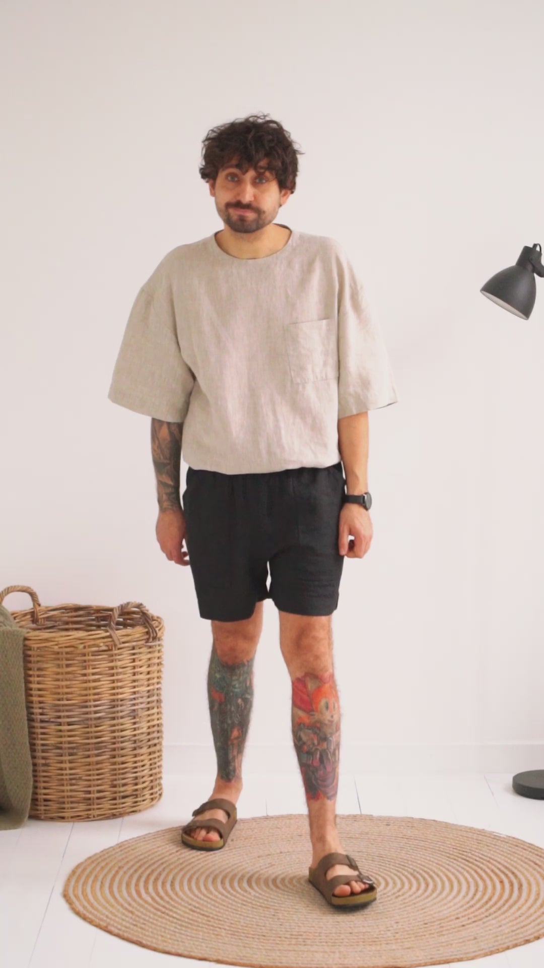 This T-shirt was designed for those who like a loose fit and a narrow neck. Since linen fabric does not stretch, we added a neat snap on the back.