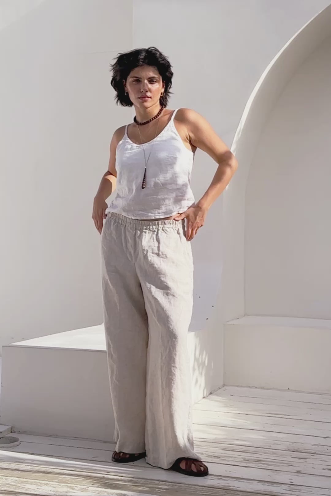 This minimalist linen camisole is a versatile essential for any warm-weather wardrobe. It features a soft scoop neckline, straight-cut back, and adjustable straps, all tailored in lightweight breathable linen. The relaxed silhouette offers comfort and understated elegance, whether worn as loungewear or a summer staple.