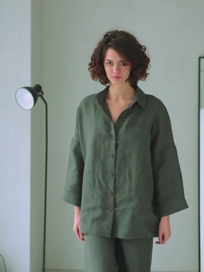 This oversized linen shirt is your go-to for laid-back elegance. Designed with a soft drape, wide 3/4 sleeves, and a chest pocket, it offers the perfect blend of comfort and structure. Style it as a lightweight layer, beach cover-up, or minimalist staple for your everyday wardrobe.