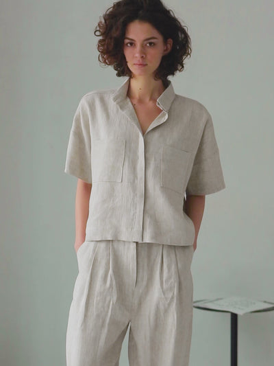 This cropped short sleeve shirt is the perfect balance of structured elegance and effortless ease. Made from soft, breathable linen, it features a boxy silhouette with two front patch pockets and a hidden button placket — ideal for warm-weather layering or as a refined everyday essential.