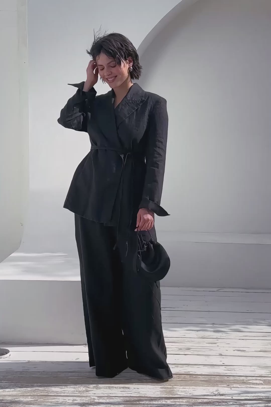 This linen wrap blazer offers a clean, soft-structured silhouette with a notched lapel and tie belt. Wear it cinched for shape or open for a relaxed look. Made from 100% European linen, it’s lightweight, breathable, and ideal for layering over dresses, tops, or pants.