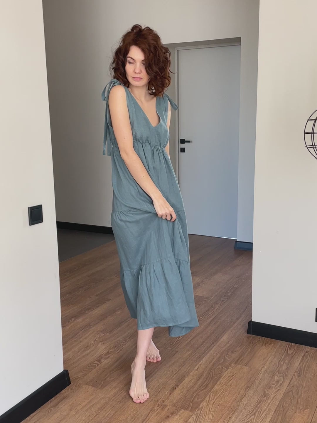 This relaxed-fit linen sundress is crafted for carefree summer days. Featuring a deep V-neckline and charming bow ties on the shoulders, it gently flows into a tiered maxi silhouette that flatters every body shape.