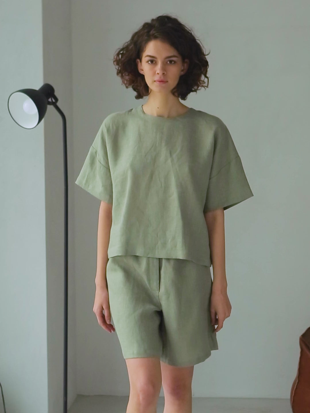 Minimalist and breathable, this linen T-shirt for women is a perfect warm-weather essential. Its relaxed silhouette and soft fabric provide effortless comfort, whether worn on its own or as part of a linen set.